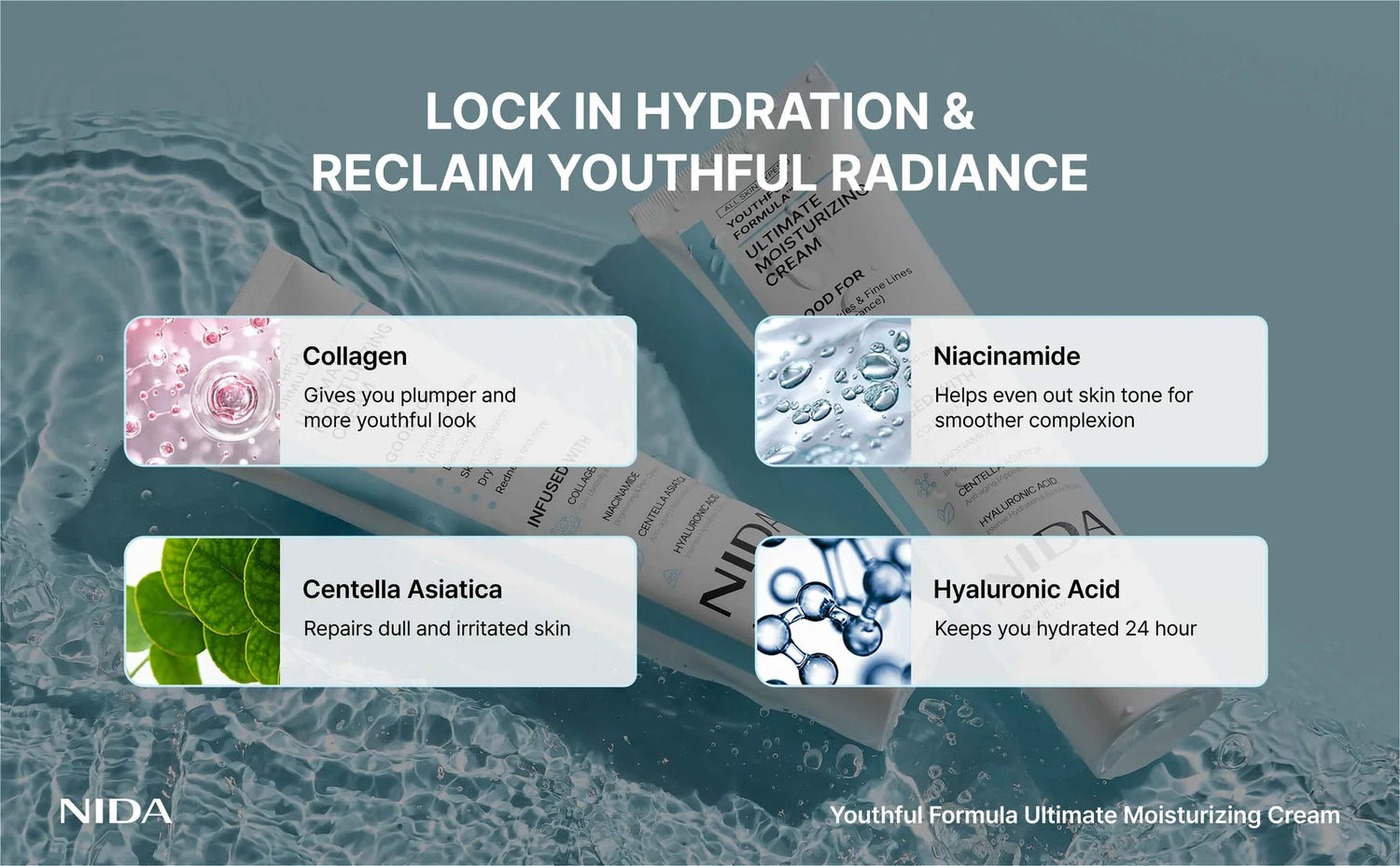 NIDA no solo hidrata, transforma tu piel. Su fórmula con ácido hialurónico, niacinamida y colágeno trabaja desde adentro para restaurar la hidratación natural, reforzar la barrera cutánea y estimular la producción de fibras que mantienen la piel firme y elástica. La centella asiática calma y regenera, ayudando a disminuir rojeces e irritaciones. Resultados visibles en textura, tono y resistencia, comprobados por estudios dermatológicos.